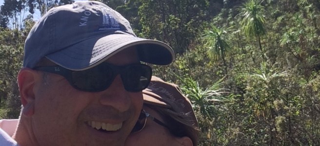 A boy, bubbling and toddling, grasps his daddy’s fingers,